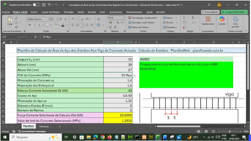 Adquira a Planilha Automática em Excel para o cálculo da Área de Aço dos Estribos Asw Vigas de Concreto Armado