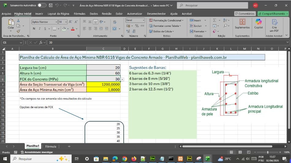 Adquira a Planilha Automática em Excel para o cálculo da Área de Aço Mínima NBR 6118 Vigas de Concreto Armado