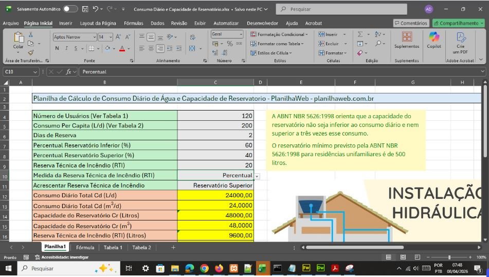 Adquira a Planilha Automática em Excel para o Cálculo de Consumo Diário e Capacidade de Reservatório